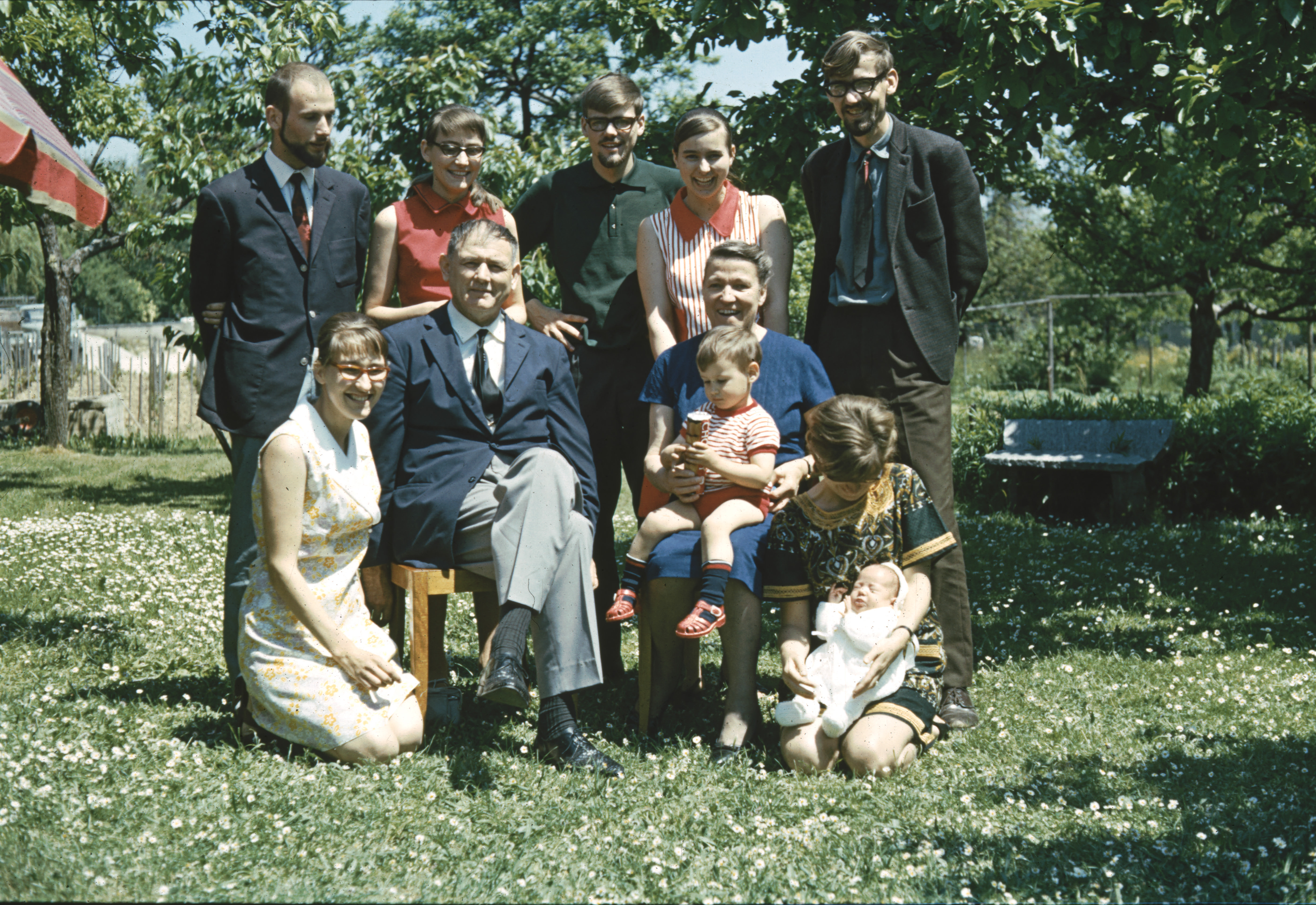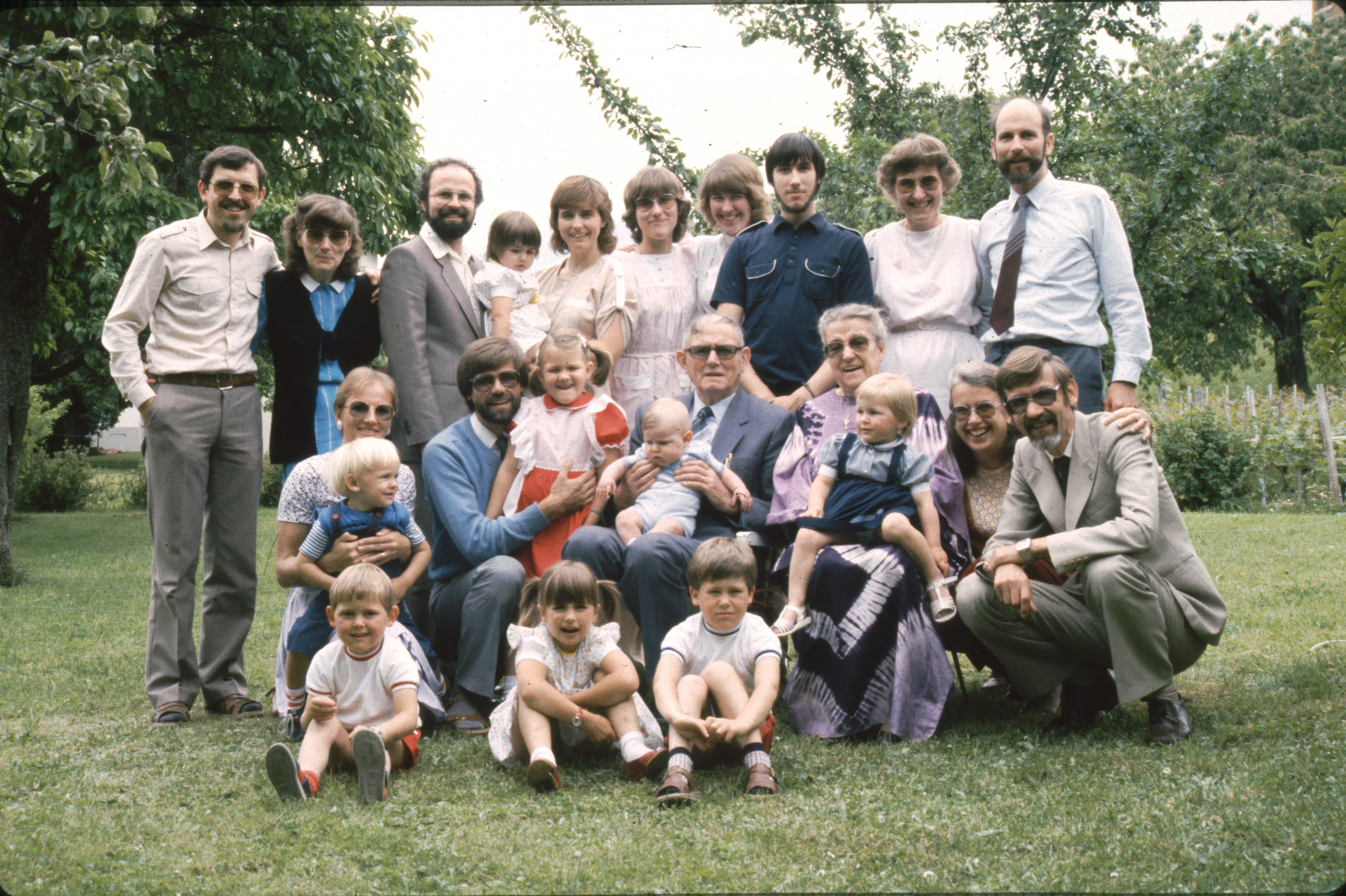Georges-Ali et Edith entourés de leurs enfants et petits enfants en été 1985.